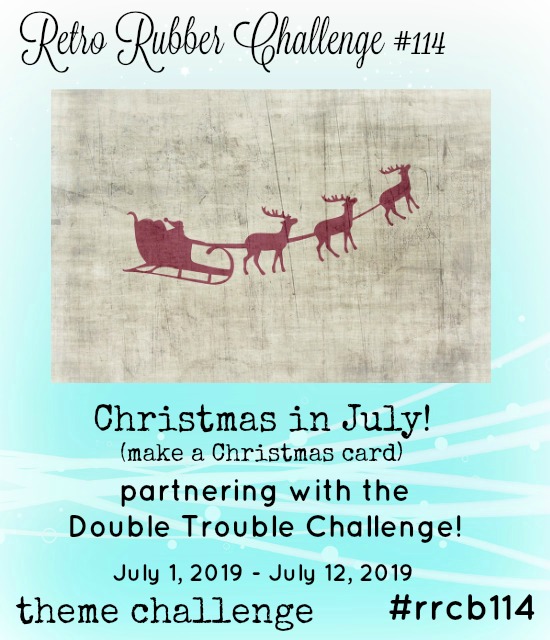 Here is Double Trouble Challenge #32 "Be Square - Christmas in July" partnering with Retro Rubber Challenge #114 wherein you use old stamps. It's usually pretty easy to find old stamps for Christmas, but hard not to choose one of your new ones. However, Retro and Double Trouble have partnered together to give old stamps some love.