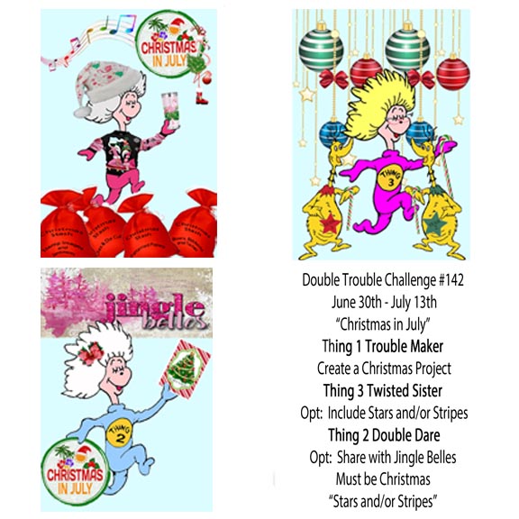 Please stop by and have some fun with our Double Trouble challenge and check out to see what our Team Members and Entrants have created. Don't forget to check out our collaborating partner at Jingle Belles and see their Design Team members and entrant projects. Hope to see you there!
