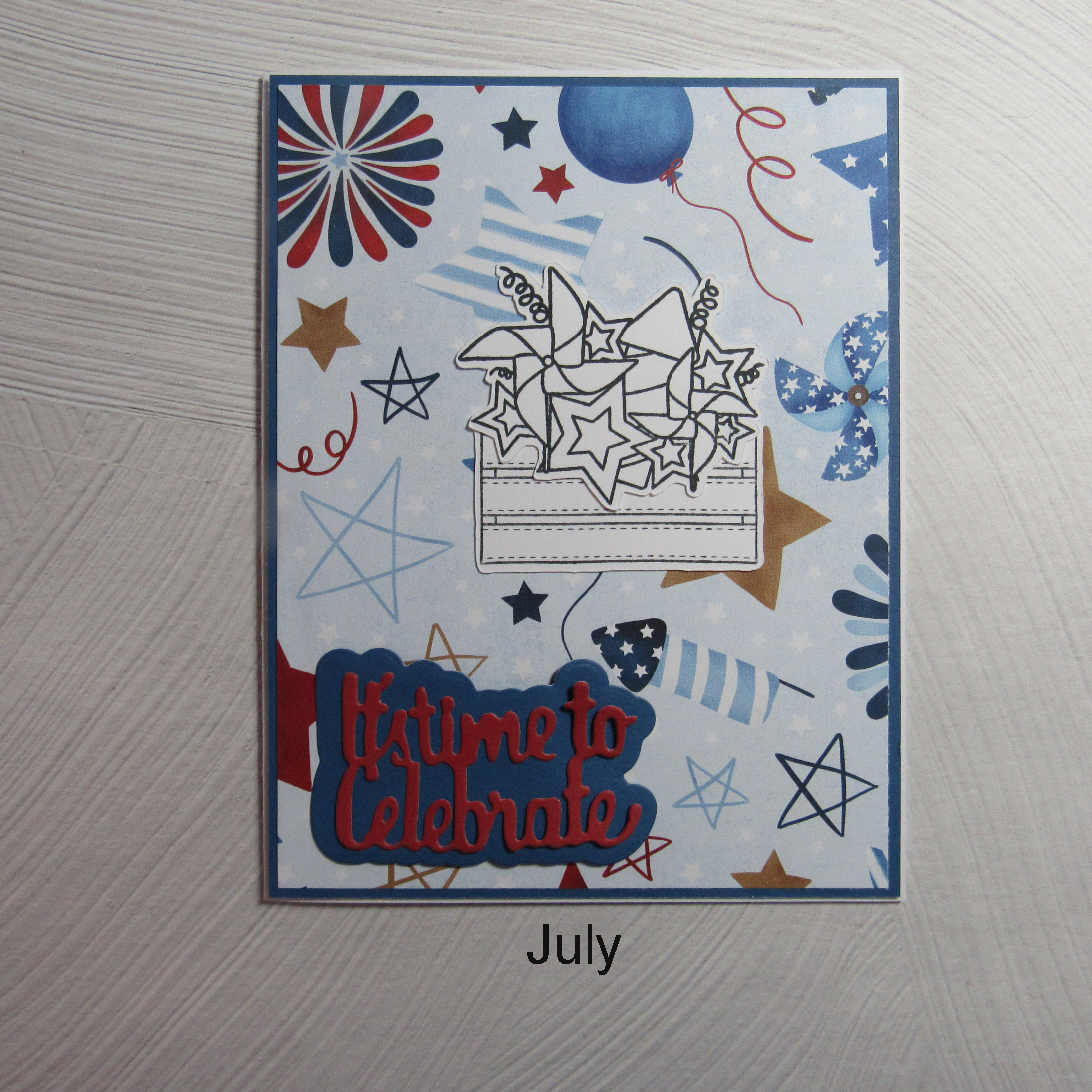Assuming they are new crafters to cardmaking the first twelve cards were all cut, not assembled; but photos were taken to help them with the layout. My DT card was the June Card Kit for a Birthday card.